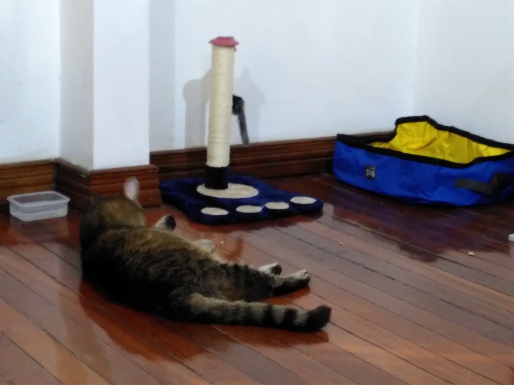 When we arrived at our new home, a bag of cat sand and a scratcher were already waiting for us. I had ordered them one week before through http://www.todomascotascr.com. We just needed to open our foldable cat litter box (see photo below), place some sand…and she was settled. She immediately went for the water and the toilet and then relaxed. Pura Vida!