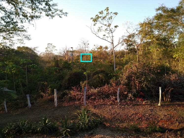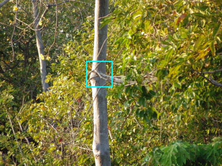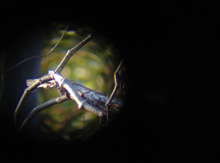 The pictures below give an impression of the magnification. Notice that the pictures were not taken from exactly the right angle. The tree behind the twigs in the blue box of the left photo has moved to the left in the right photo.