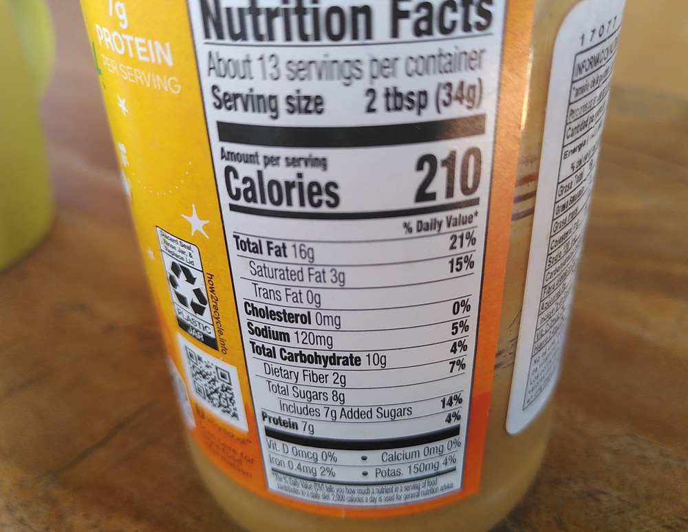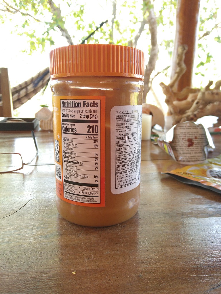 Challenge 2: Make the calculations. The 8 grams of sugar indicated in the label are per 34 grams of a suggested portion. The aforementioned means that the “added sugar” content of this peanut butter is 23,6 % and not the 14% that we would initially have thought by mistakenly looking at the percentages, particularly if we come from Europe. In Europe, we are used to finding the information on the calories, fat and sugar content of the product per 100 grams, which allows for easy comparison. But here, the information provided is per portion (SIGH!), following the North American style. And that makes things complicated. Not only each product has a different serving portion but each brand has a different recommended portion. So, deciding which product has a lower sugar content becomes a mathematical challenge.