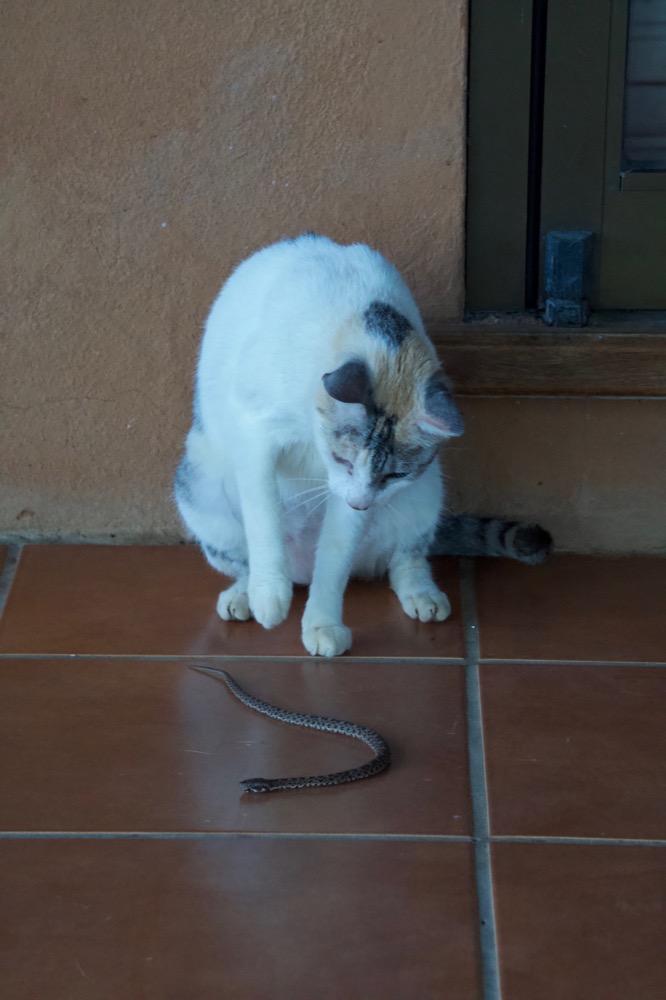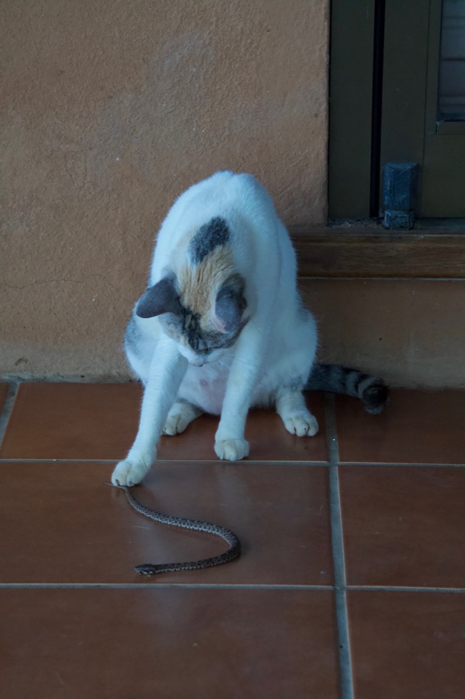 And, as if the universe was listening, the next morning, when I go out of the house to feed Manchita, she was waiting for me with a shitty little snake. What we would call in Spanish a “culebrilla”.