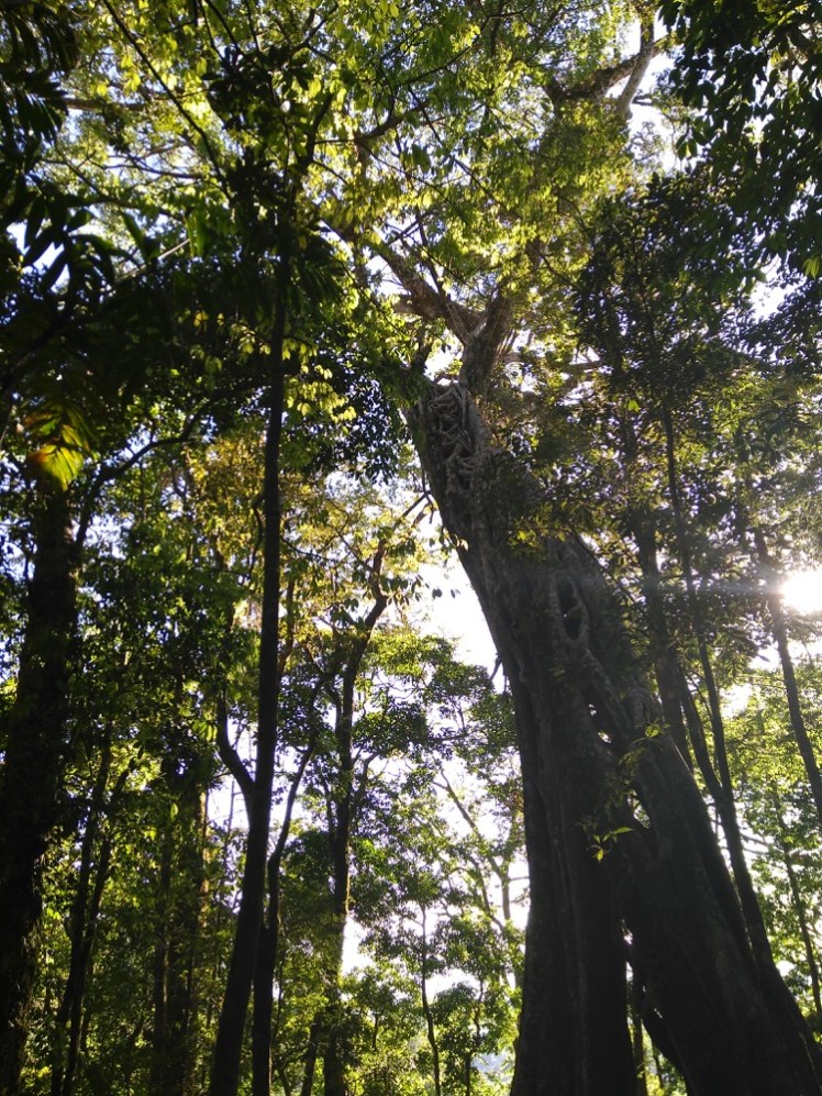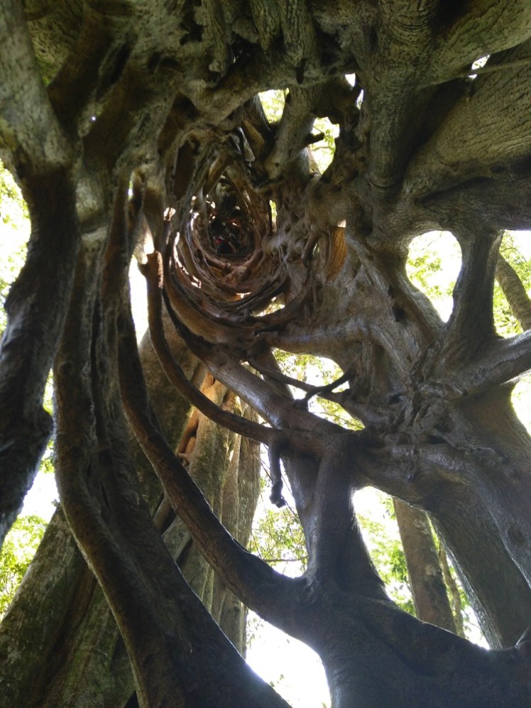 Ik houd het kort, want er komt ongetwijfeld een fotopagina of twee en wellicht aparte verslagen van de uitstapjes. Zondag middag hebben een wandeling naar een stel enorme bomen met ‘strangler-figs’ ofwel wurgvijgen (als ik het goed vertaal). Wurgvijgen zijn klimplanten die als een net helemaal om een boom heen groeien. Ze strengen kunnen enorm dik worden en de plant kan zo groot en dicht groeien dat de boom sterft. De wurgvijg is dan zo sterk gegroeid dat ie op zichzelf kan blijven staan. Vlakbij Santa Elena is zo’n wurgvijg waar je aan de binnenkant omhoog kan klimmen.