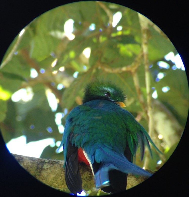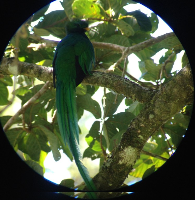 Gisteren hebben we een vogelkijkwandeling met gids geboekt. De gids, A., was niet goedkoop maar waanzinnig goed. De eerste anderhalve uur heeft hij ons op een eenvoudige parkeerplaats en rond een bakkerij van de ene vogel naar de volgende gezeuld. Daarna was het tijd voor het echte werk in het Curi-Cancha rervaat. Het enthousiasme van de gids werkte aanstekelijk en ons groepje was zo enthousiast dat hij ons nog een uur wandelen kado heeft gedaan en vervolgens nogeens in een halfuurtje een lijst heeft opgesteld van alle vogels die we gezien hebben. Meer dan 50, inclusief de Quetzal, een vogel waarvoor mensen naar midden Amerika reizen.