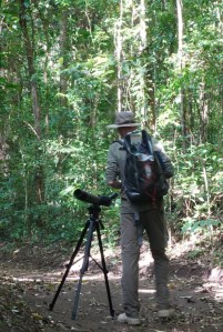 The expert birdwatcher comes equipped with a decent pair of binos and a small but high quality telescope with a huge ‘pupil’ so that it is really easy to look through. In terms of magnification, I am guessing B.’s telescope magnified about 20 times or a bit more. So apparently that is good enough, at least for birdwatching in the jungle.