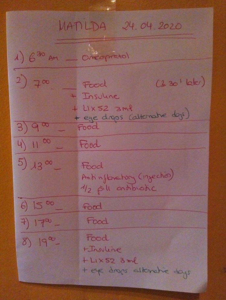 Gelukkig had de dierenarts ondertussen de benodigheden voor verder bloedonderzoek ontvangen en het bleek dat Matilda’s lever ontstoken was. De vraag blijft of dat de oorspronkelijke reden was dat ze ziek werd of dat de leverinfectie het gevolg was van een week heel weinig eten. In ieder geval wist de dierenarts nu veel beter wat Matilda nodig had. En dat was nogal wat: antibiotica (een ander soort dit keer), een maagzuurremmer, een ontstekingsremmer en een koortsremmer. Dat kwam dan bovenop de insuline en de oogdruppels. O ja, we moesten haar elke twee uur een speciaal proteïnerijk eten geven of forceren.