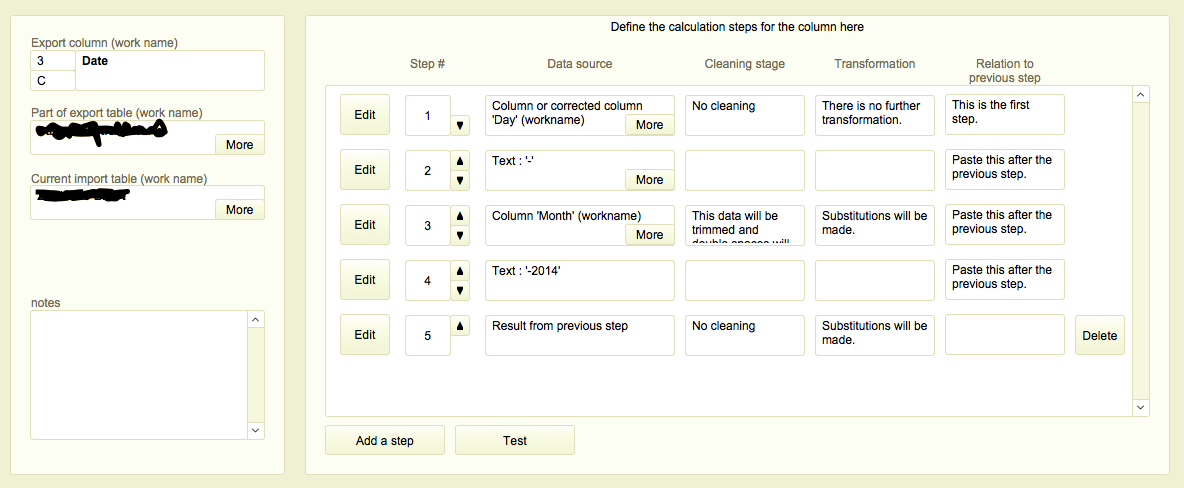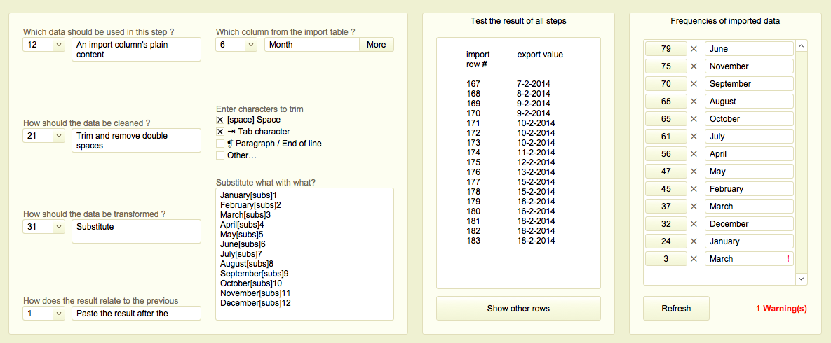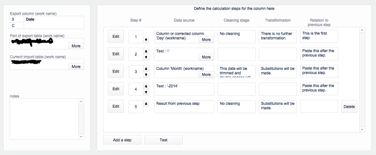 The database allows you not only to make corrections to (that is, added to) individual cells in the import tables, it also gives you the possibility to change the formatting or regular mistakes in the data. For example, a column may contain dates in different formats, or someone often miss-spells a particular name. Advanced programming of specific transformations is also possible. With a simple test facility you can quickly see the result of the changed formatting and manual corrections.