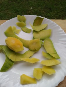 Toen hij ons dat vertelde stonden we voor het huis van zijn oma waar een grote mangoboom bij stond. Hier is een video waarin je ziet hoe hij de mango’s oogste met een dikke bamboestok.