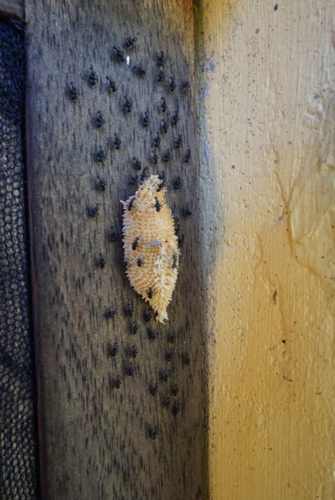 De volgende M is voor een Mysterieus nest dat we op een goede morgen enige tijd geleden aan het raamkozijn vonden. We hadden geen idee wat het was, en dus vroegen we de insectenkenners van Osa Conservation. Die dachten aanvankelijk dat het een nest van een bidsprinkhaan was. Afgelopen week kwamen de eerste broedsels uit. Geen bidsprinkhaantjes. Geconfronteerd met nieuw bewijsmaterial, hield men het nu op Fulgoriden of Lantaarndragers. Insecten met een gekke neus.