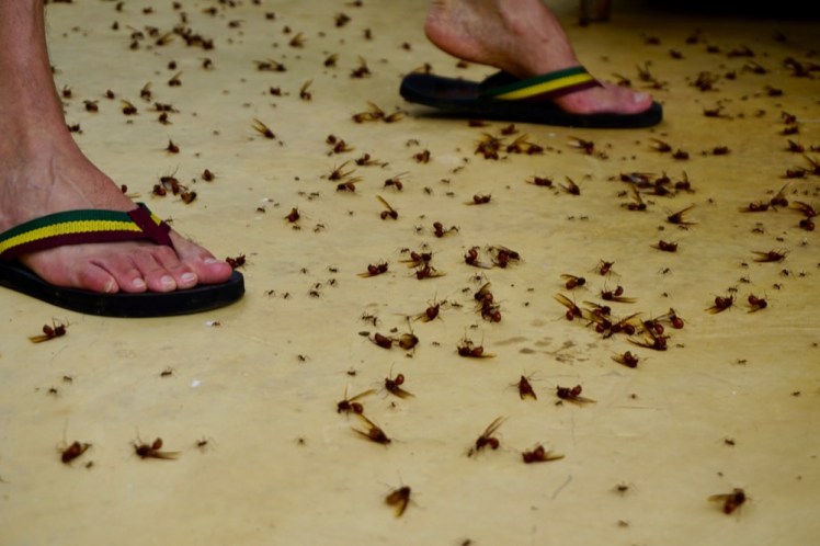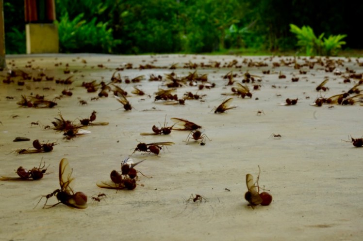 De derde M is voor Mieren en Massa sterfte. Op een morgen lag de vloer onder het afdak vol met dode mieren met vleugels. Eens in de zoveel tijd zwermen de ‘princessemieren’ uit om te paren met speciale mannelijke mieren. Die mannen leven maar voor één ding en dat is dat (klinkt dat bekend?). Daarna sterven ze. Waarom dat op massale schaal gebeurt is waarschijnlijk om de kans op succes te vergroten. De vliegende mieren zijn namelijk erg in trek bij nogal wat insecteneters : vogels, libelles, vleermuizen, enzovoorts. Vermoedelijk omdat we ‘s nachts het licht buiten aan hebben, kwamen veel vliegende mieren daar opaf.