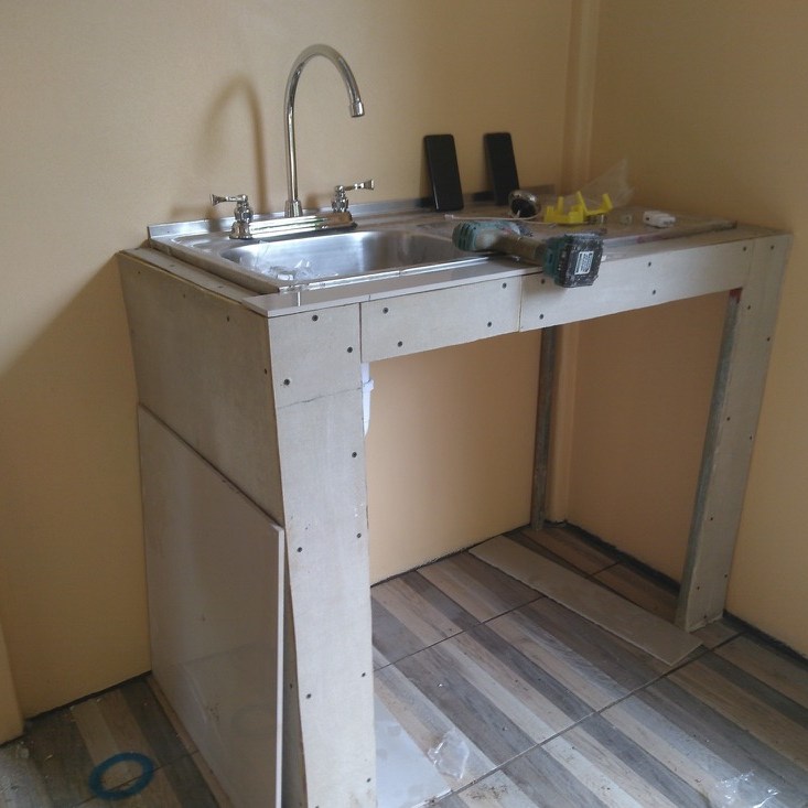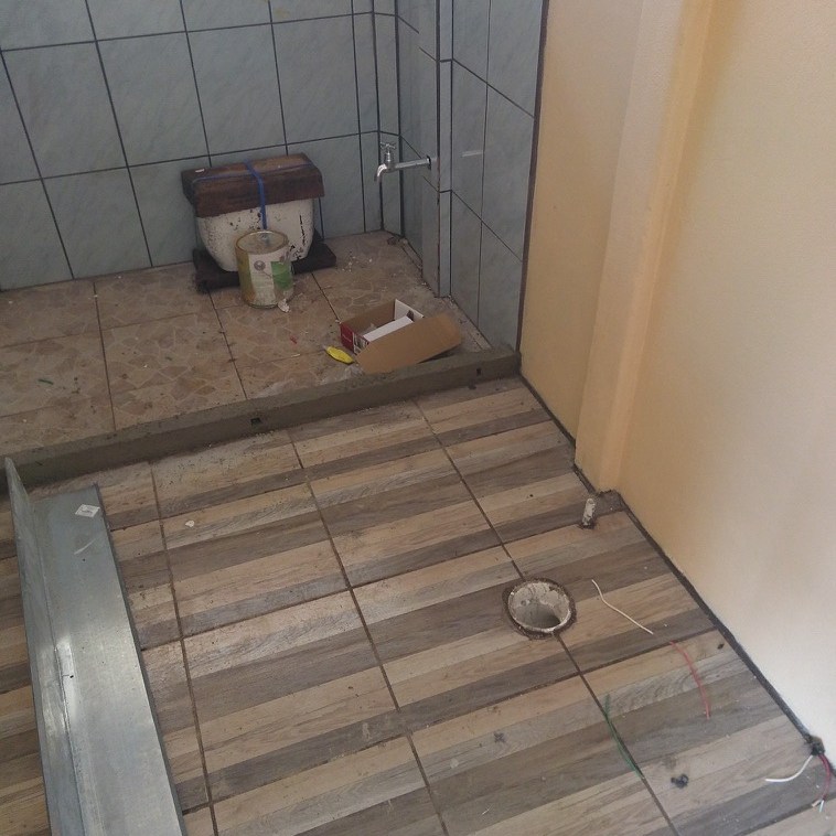 The house is initially built directly on the earth, so that channels can be dug for the plumbing to the bathroom and the kitchen. After that a cemented or concrete floor is added, with optional (I guess) tiles.
