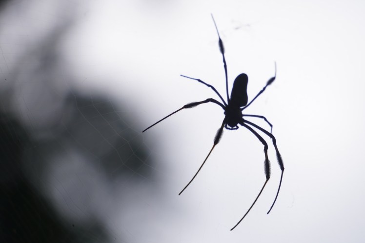After two days, Bella got company from a male. The males of the golden silk orbit spider are markedly smaller than the females. We saw only one, but apparently, normally there are more. How they decide who gets to mate is a bit complicated, but there is a good chance for the males that they survive the event. They wait until the female is eating, which is when she is less aggressive. I find them quite courageous.