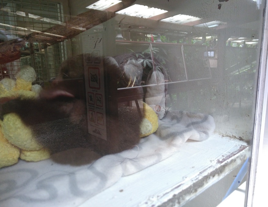 Na de rondleiding werden we meteen aan het werk gezet. Cristina in de keuken en ik in de wasserij. In de keuken wordt de hele dag voer bereid voor de planten-etende dieren en er is een grote doorstroom van plastic schotels en bakjes. Dat moet allemaal weer schoon voor de volgende ronde. De wasserij heeft ook een hoop te doen. Er is een dierenkliniek, een kinderkamer en ook de apen gebruiken allerlei dekens en ander spul dat gewassen moet worden. Mijn werk was alle goederen een voor een checken en aangekoekte poep verwijderen (met een tuinslang en water onder druk). Vervolgens moet alles 15 minuten weken in een ontsmettingsmiddel en vervolgens moet alles uitgewrongen worden. Daarna gaat het pas de wasmachine in, maar dat wordt door iemand anders gedaan. Vooral het uitwringen is veel en zwaar werk. Hier en daar kan je zien, zoals op de volgende foto, hoe al die spullen van pas komen en dat geeft veel voldoening.