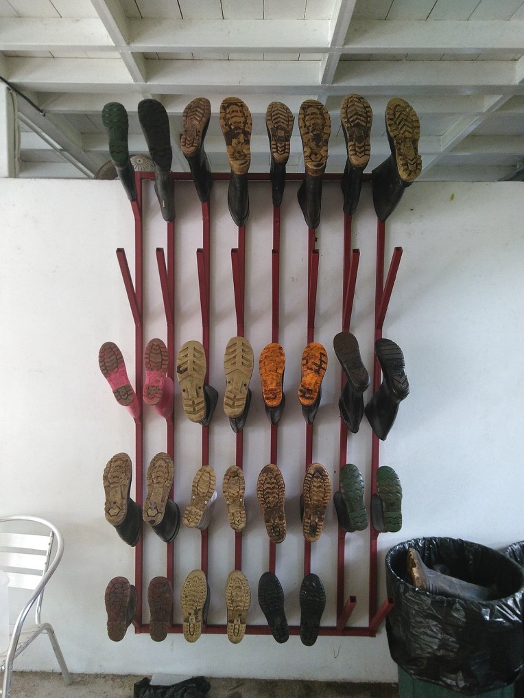 En tussen alle dagelijkse bezigheden door kan het zijn dat we hier of daar gevraagd worden voor een andere klus. Een keer iets aanvegen, de pelikaan uitlaten, of laarzen checken. Laarzen checken? Ja, er was een nieuw rek gemaakt om de rubber laarzen te drogen en te bewaren. De laarzen lagen in een grote plastic zak opgeslagen en moesten op lekkage gechekt worden. Dat was het enige dat nog moest gebeuren, maar bij gebrek aan vrijwilligers lag dat al weken of maanden op iemand te wachten.