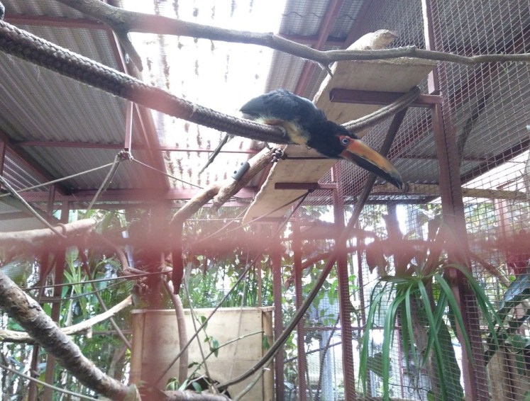 Half a week later, the aracari just jumped on my arm as soon as I entered the cage while making its characteristic purring sound that makes any cold heart melt. Try to ignore that. It is impossible. The solution is to calmly but as as soon as possible, make it hop off your arm. Just bring it to a branch, and it will hop onto it. After a couple of times, it gets the hint. No hopping on humans, or at least this human.