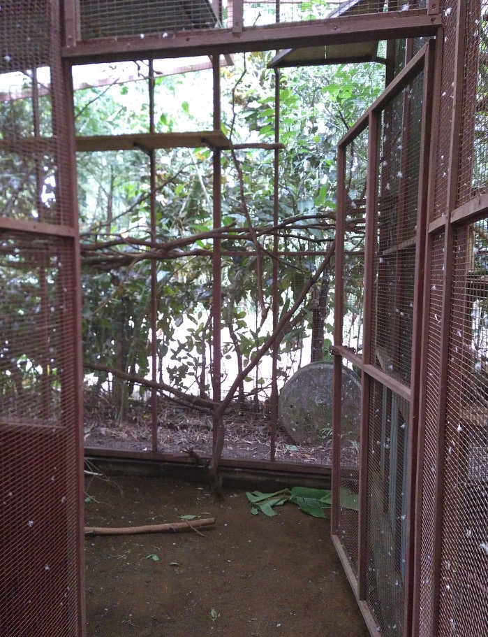 The first week and a half, I had virtually no problem ignoring the birds. They all kept their distance. But after that, they started creeping into my private space. The first were the blue headed and white crowned parrots that started their work already in the first week. They are funny birds, with funny sounds, and they show a lot of interest in what I am (or anybody who enters the cage is) doing. Well, first they devour the food that I bring in. Then they slowly start to surround me. Mostly by hopping towards me over the branches that are put across the cage. They are hopping, rather than flying, although that happens too. And then it begins with one that starts carefully nibbling my sock or shoe. Or my shirt. Or any part of me and my clothes that is colorful. Especially red is a color of interest. I shrug them off and that keeps them away. For some time. And then the hopping starts again.