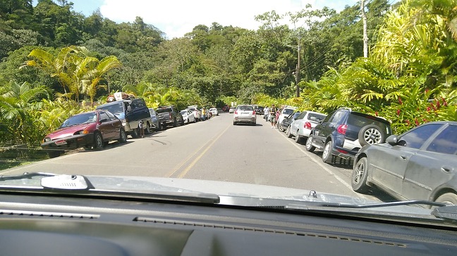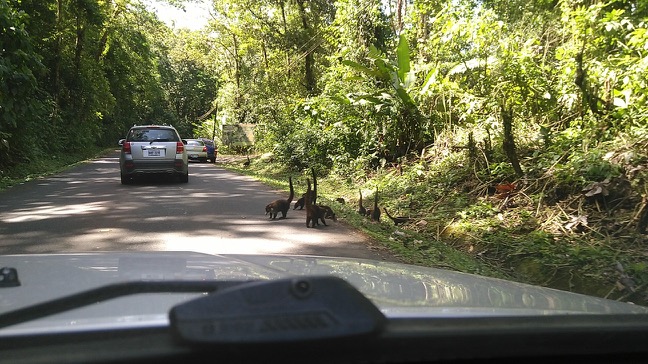 Zaterdag was een (bijna) niets-doe dag. Gewoon een dag in en rond ons huisje hangen, vogels kijken, boek lezen, bloggen, wat van wat zon en het uitzicht op de vulkaan genieten. De vulkaan liet zich die dag voor het eerst geheel onthullen, ookal duurde het niet lang voor de top weer door een volgende wolk werd verhuld. We waren niet alleen hard aan een niets-doe dag toe, we mogen op zaterdag ook niet met de auto rijden. Behalve dan naar de plek voor de jaarlijkse keuring aan het eind van de middag. Interessant was dat het een mobiel keuringsstation was. Een zeecontainer met testapparatuur, een oplegger truc met een kantoor erop en een paar tenten eromheen. Je moet van tevoren boeken, maar je hoeft dus niet helemaal naar San José te rijden voor de keuring. De keuring zelf ging gesmeerd zogezegd, en we kregen de nieuwe sticker meteen mee.