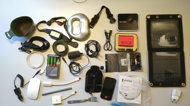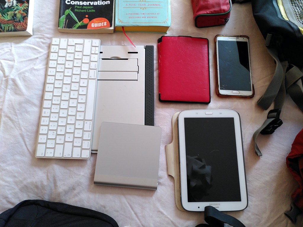 I brought my macbook air, a dual-sim phone, a tablet, a kindle and the wireless keyboard and trackpad of my mac. None of the electronics was new. Both the tablet and the phone started to have problems half way the year and in both cases it had to do with the screen. They did not make it till the end of the year.