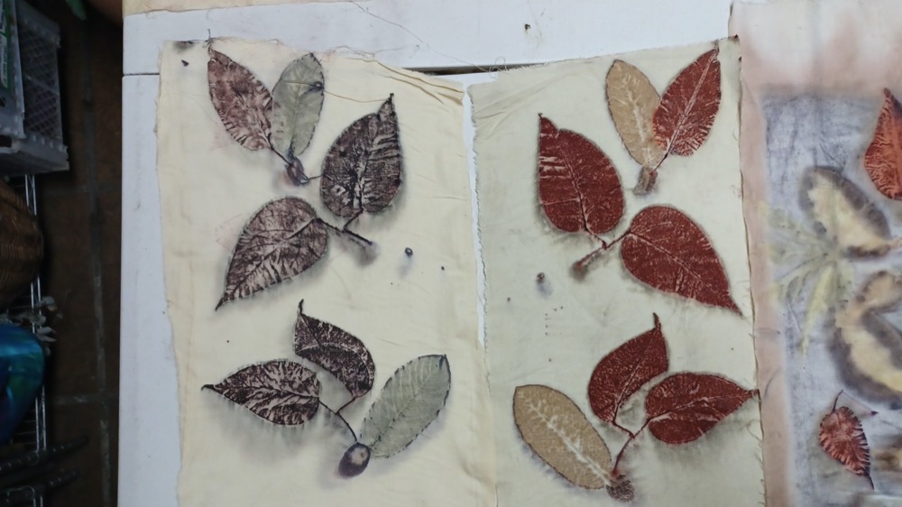 Last, we had a teaser combining natural tannin (in this case one home made with the flower of the banana) with the blanket techniques. In this later exercise we added a leaf (the coral leaf) that does not imprint but that “resists” the imprint – this means that it becomes like a negative, with the tannin surrounding the shape. The results were absolutely amazing.