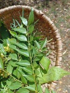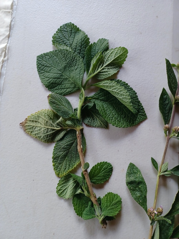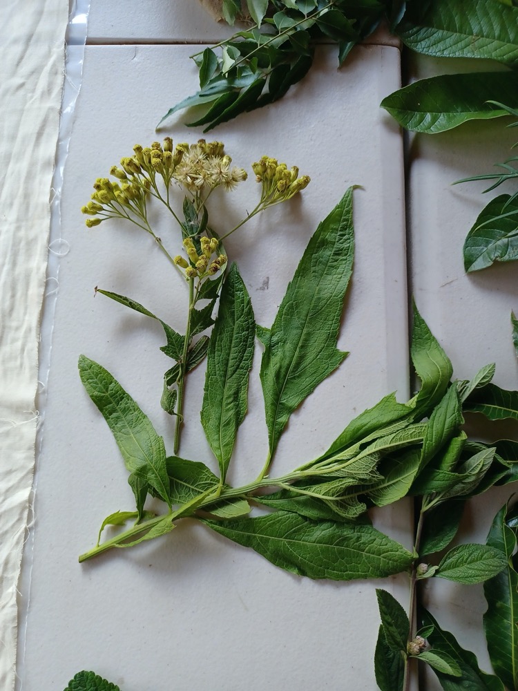 We started by walking around the garden, selecting leaves that work well for imprinting. We collected around a dozen different leaves (and some flowers). Many of them are medicinal or aromatic plants.