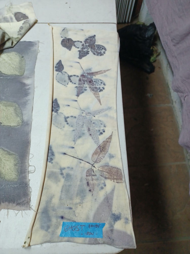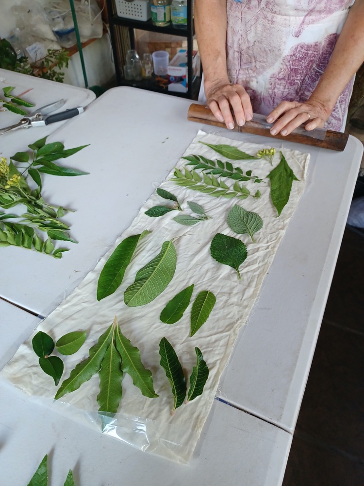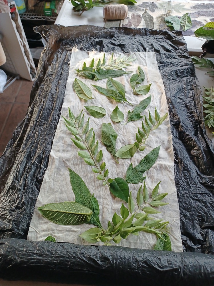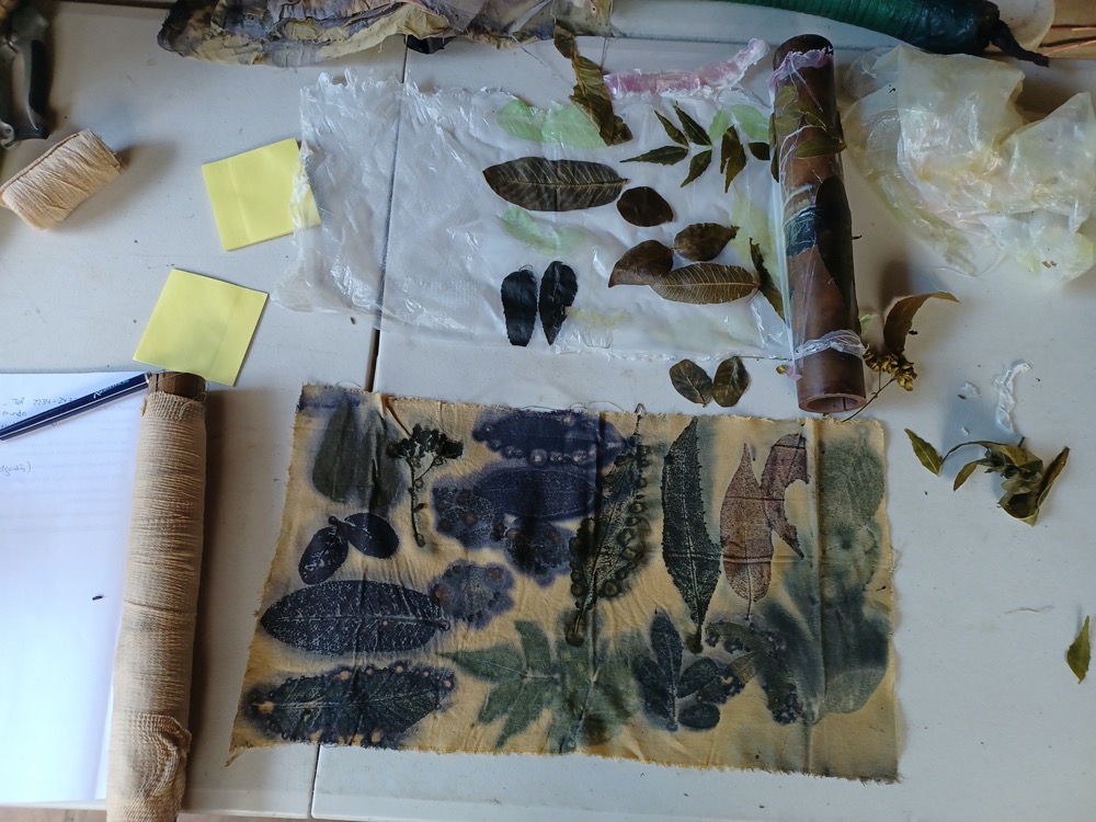 Back in the studio, we started by testing how different leaves imprint on silk or cotton, using the same binder (iron sulfate). We also tested how the two sides of the leave had a different imprint. We then prepared the two fabrics with the iron sulfate and placed the leaves on the cloth. Then we rolled it very tightly using bamboo and wrap it with medical elastic band (of the sort that is used at the vet). The wrap was ready to be steamed.