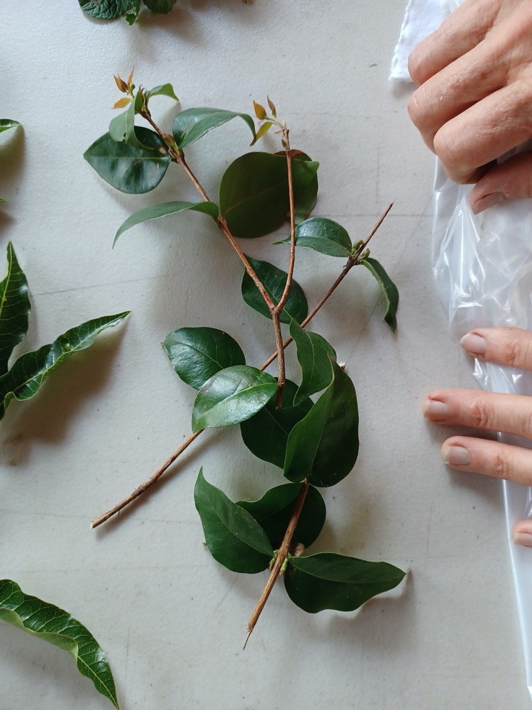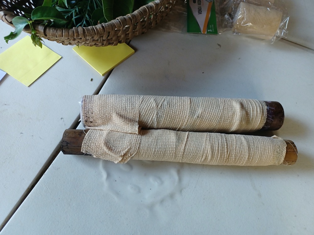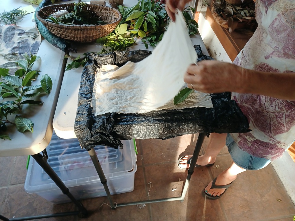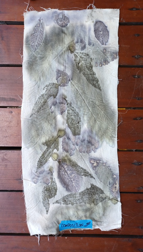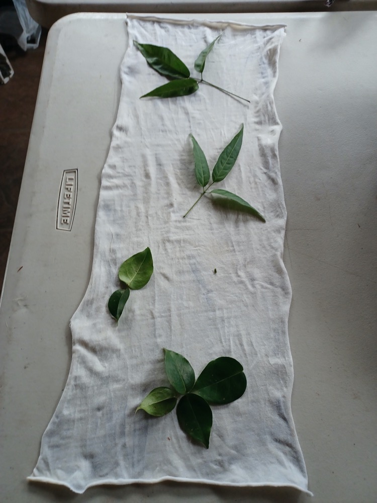 Back in the studio, we started by testing how different leaves imprint on silk or cotton, using the same binder (iron sulfate). We also tested how the two sides of the leave had a different imprint. We then prepared the two fabrics with the iron sulfate and placed the leaves on the cloth. Then we rolled it very tightly using bamboo and wrap it with medical elastic band (of the sort that is used at the vet). The wrap was ready to be steamed.