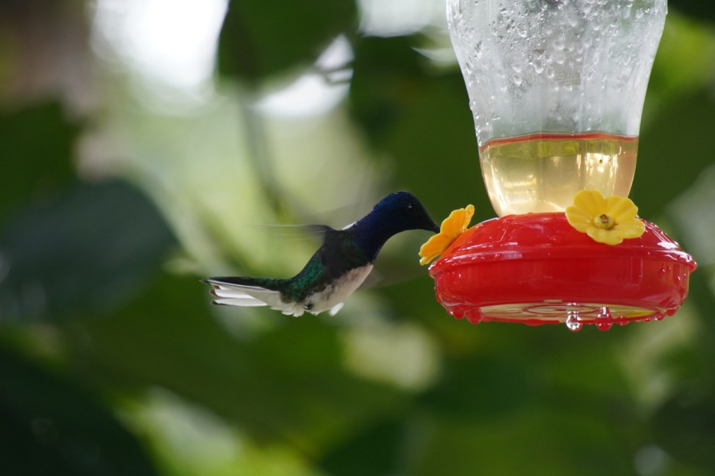 One of my favourite small pleasures of the tropics is the hummingbird feeder. It was one of the first things we bought when we returned to Costa Rica. It is super fun to see them sipping from the feeder, defending it from other “intruders”, or sneaking in while the chasing pair has disappeared in the distance.
