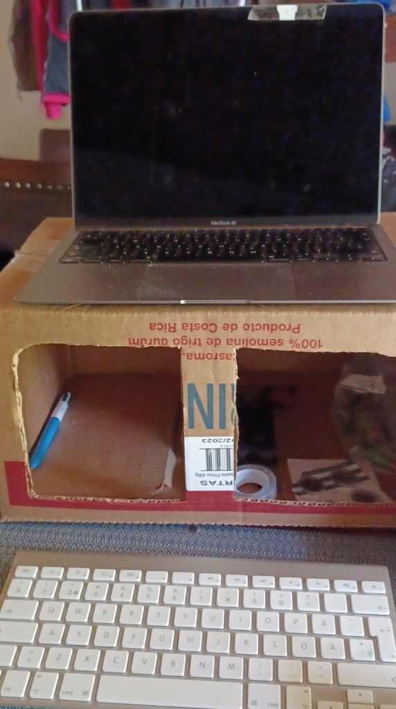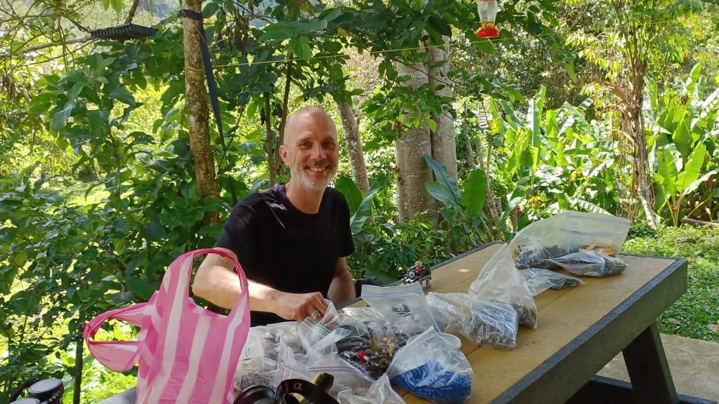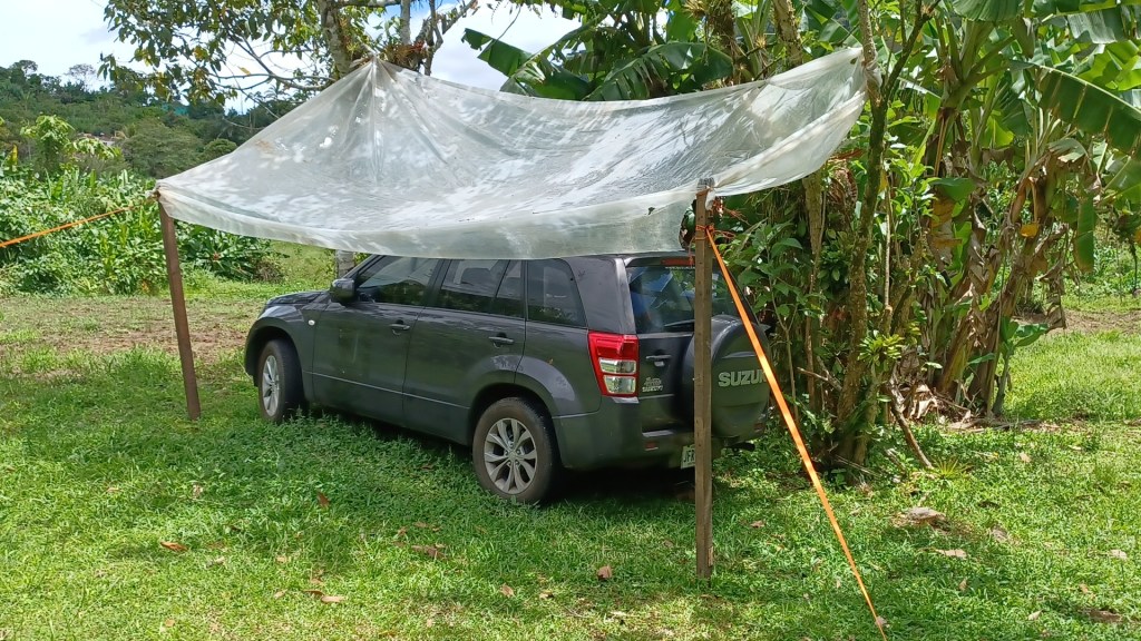 Last, we have come to appreciate the joy of simple living. Our life can be packed in a car. We need two sets of shoes – the flip-flops and the rubber boots – and maybe a third for work. We have become quite creative at finding solutions with what is available (Well, I have. I think that Frank has always been like this): A cardbox as a computer stand ; an old plastic sheet from the farm tied to some trees plus the strings that we bought to secure Kika’s crate in the plane to make a rain cover for the car ; a plastic tray and a water hose for a bird feeder. Almost everything has multiple uses. And I enjoy the challenge of trying to find solutions with the little that is available. It is FUN!