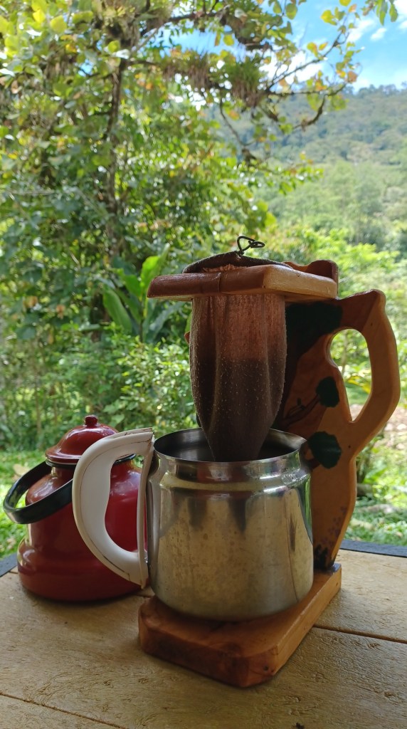 Costa Rica has A-M-A-Z-I-N-G coffee, and one does not need to go to special shops to buy it. Just the local supermarket is likely to have an incredible array of coffee blends from different country areas. If you are lucky, you can even try one produced by the local cooperative. In the house where we live now, we prepare it “Costa Rican style”, that is, using a kind of sock or textile bag for brewing the coffee, after heating the water on the stove. This is called “café chorreado”- literally poured coffee.