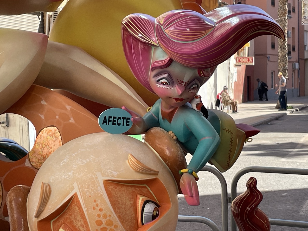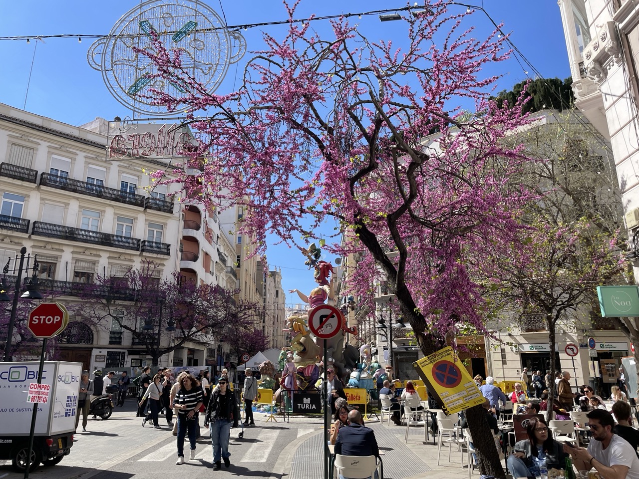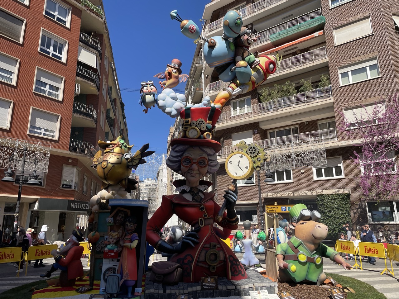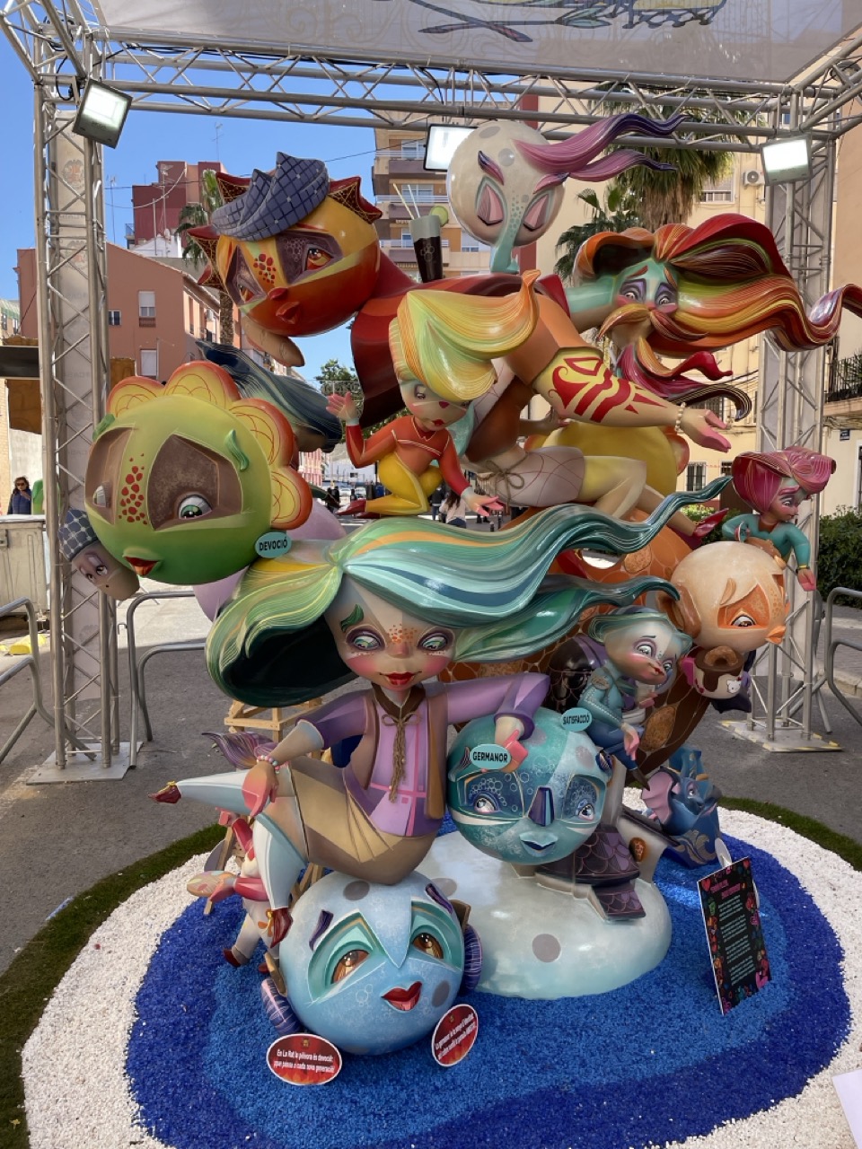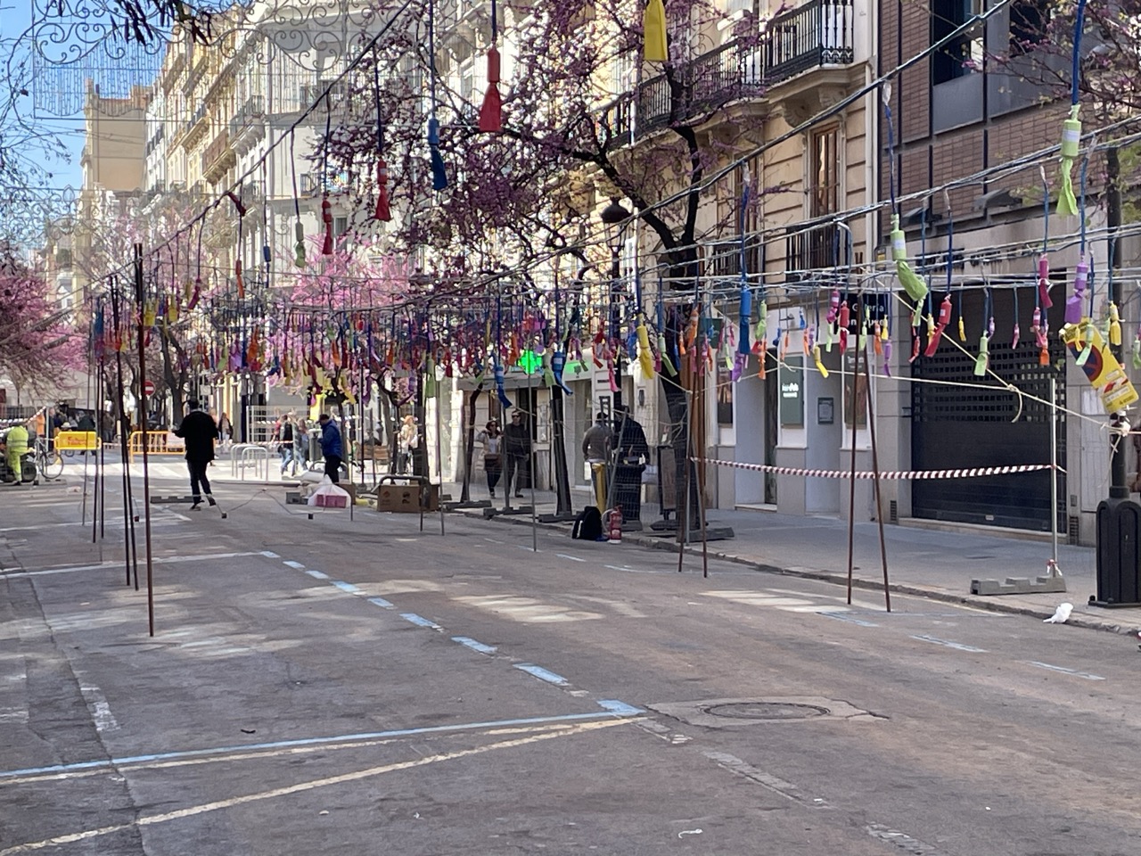 Today, I went into Valencia to see more of the Fallas, that is of the ones one can find all over town. Rather than just the spectacular ones in the inner city. Many quarters have one, often of moderate size, but definitely very much worth the while. I just wandered from the Cabanyal train station towards the harbor, further towards and through the center and continued a bit more. Here are some impressions, not just of the statues, but also of what else is part of the celebrations: the Fallas competitions, the party tents, the fireworks, the flower displays, the churros and porras, the crowds, the scarfs, the traditional clothes and the spring blossoms. Do scroll down to also see the videos of a small parade and the daytime fireworks at the central square / Plaza del Ayuntamiento.