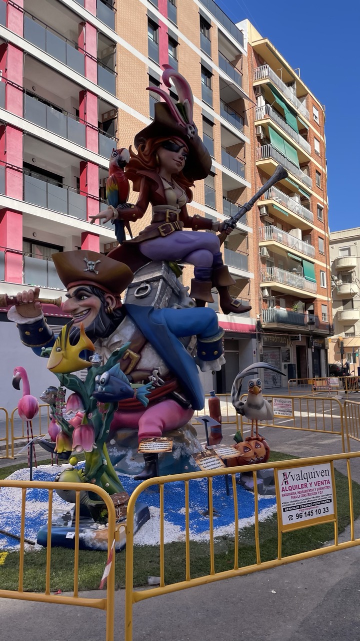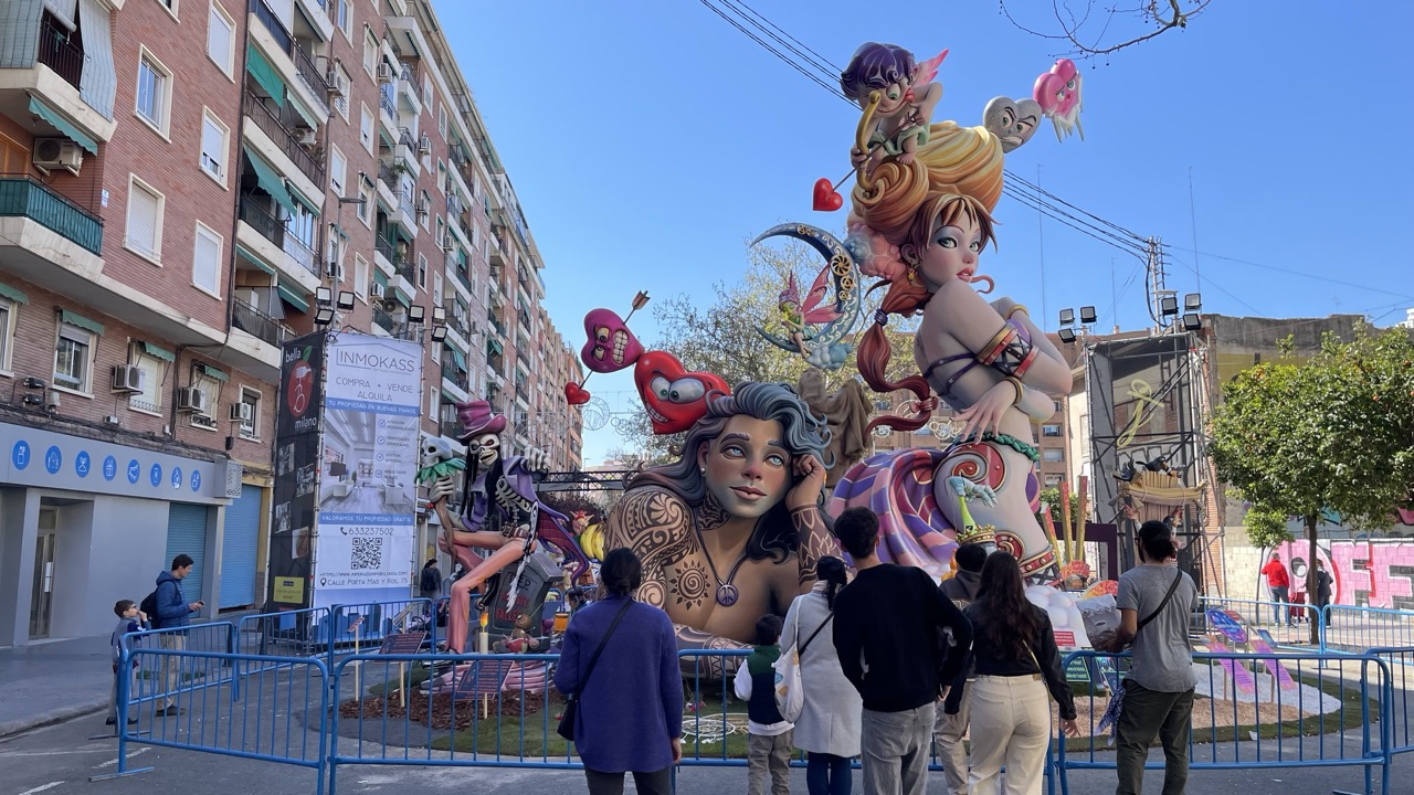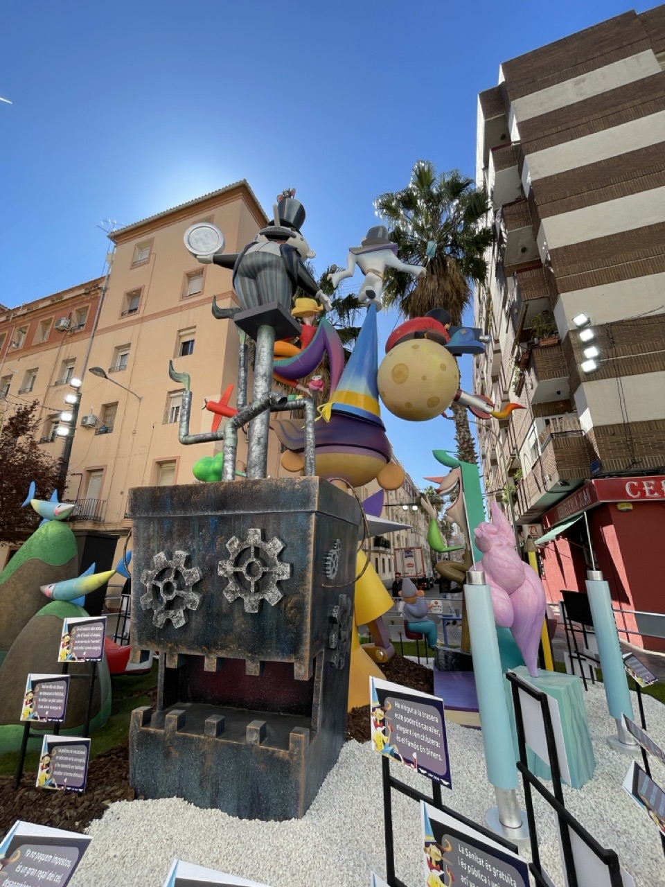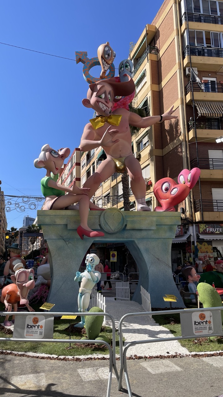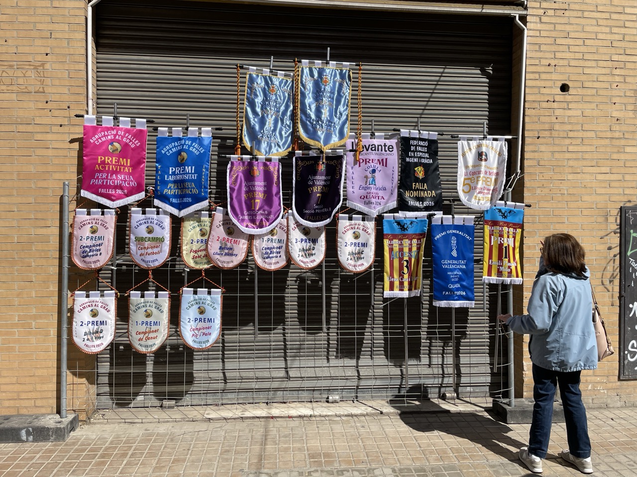 Today, I went into Valencia to see more of the Fallas, that is of the ones one can find all over town. Rather than just the spectacular ones in the inner city. Many quarters have one, often of moderate size, but definitely very much worth the while. I just wandered from the Cabanyal train station towards the harbor, further towards and through the center and continued a bit more. Here are some impressions, not just of the statues, but also of what else is part of the celebrations: the Fallas competitions, the party tents, the fireworks, the flower displays, the churros and porras, the crowds, the scarfs, the traditional clothes and the spring blossoms. Do scroll down to also see the videos of a small parade and the daytime fireworks at the central square / Plaza del Ayuntamiento.