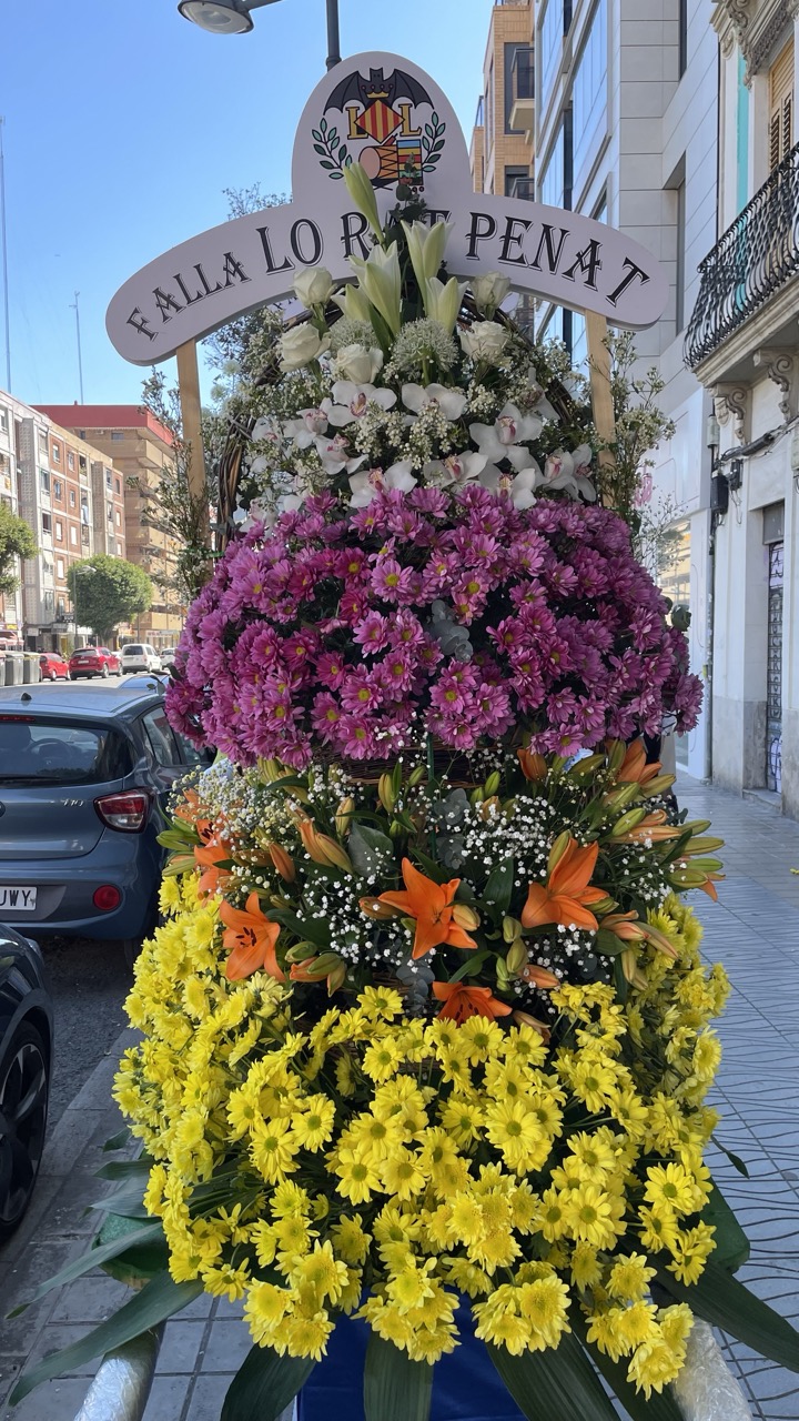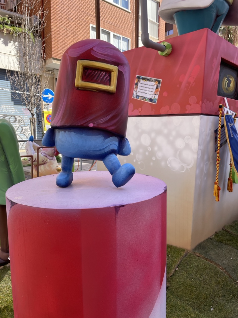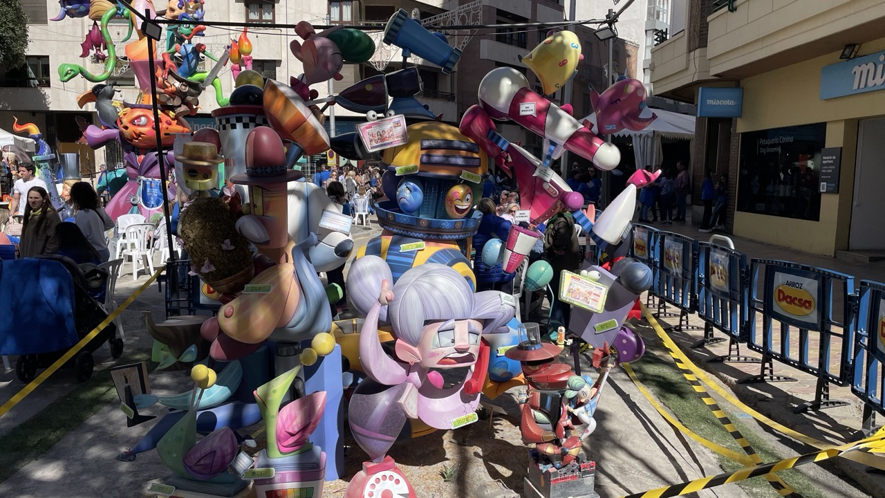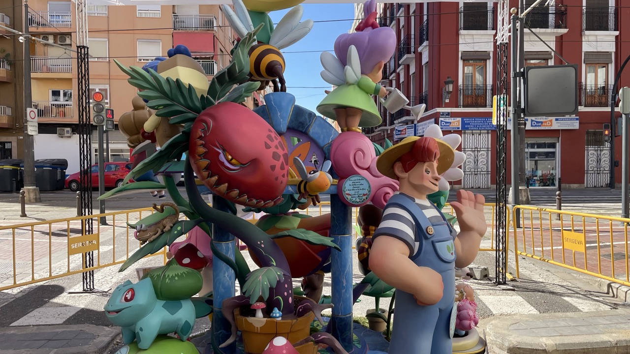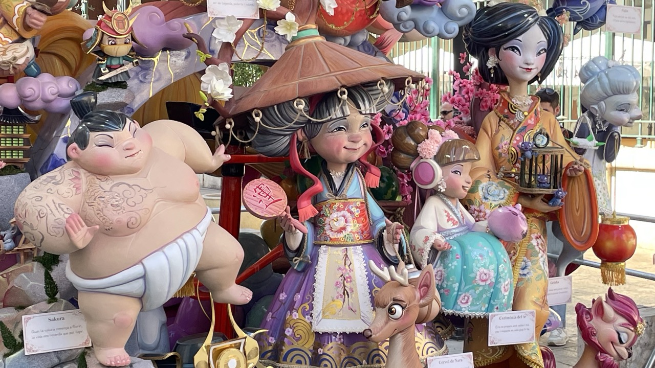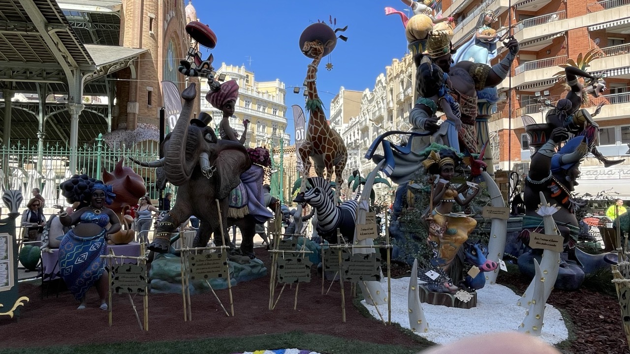 Today, I went into Valencia to see more of the Fallas, that is of the ones one can find all over town. Rather than just the spectacular ones in the inner city. Many quarters have one, often of moderate size, but definitely very much worth the while. I just wandered from the Cabanyal train station towards the harbor, further towards and through the center and continued a bit more. Here are some impressions, not just of the statues, but also of what else is part of the celebrations: the Fallas competitions, the party tents, the fireworks, the flower displays, the churros and porras, the crowds, the scarfs, the traditional clothes and the spring blossoms. Do scroll down to also see the videos of a small parade and the daytime fireworks at the central square / Plaza del Ayuntamiento.