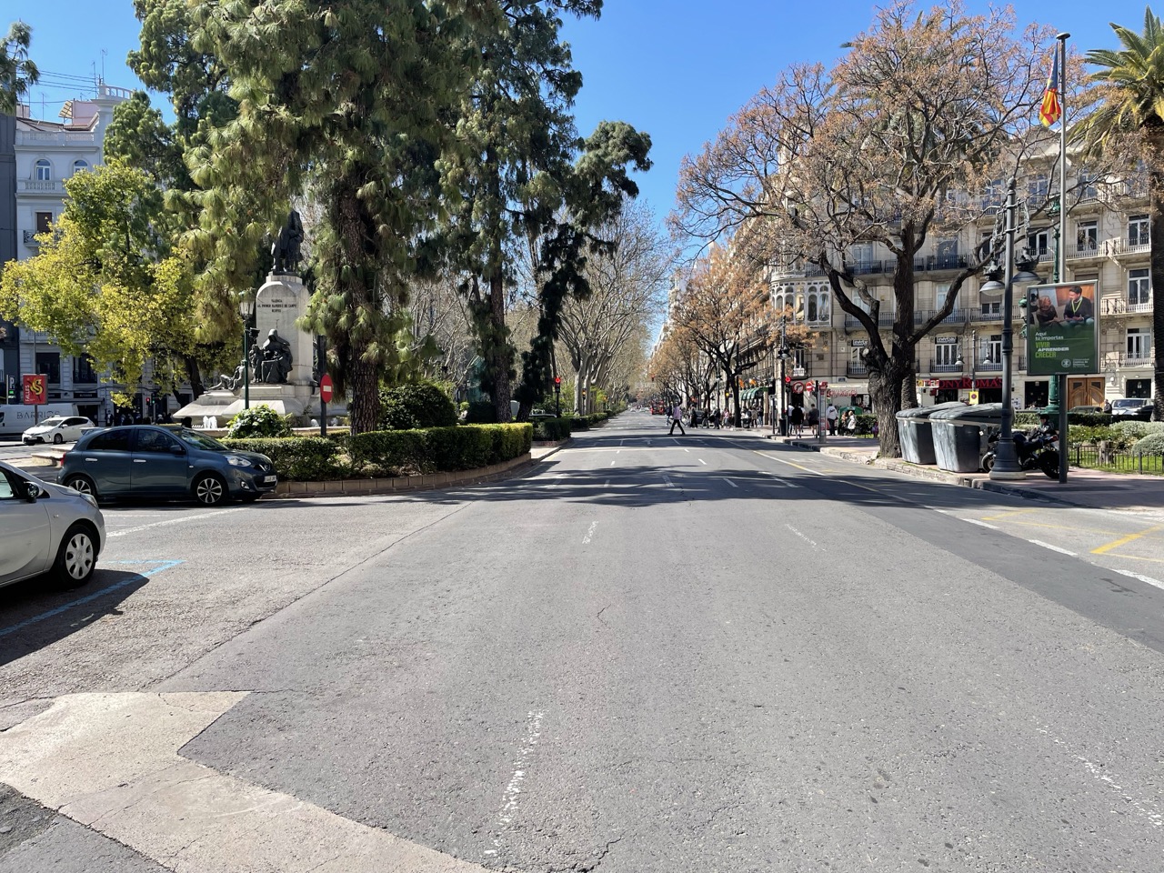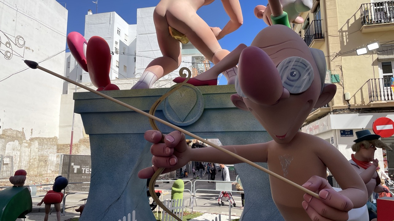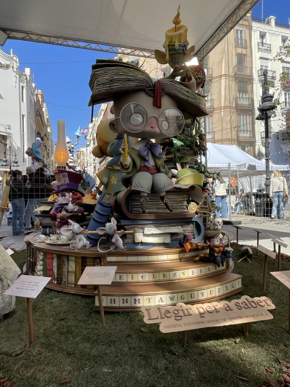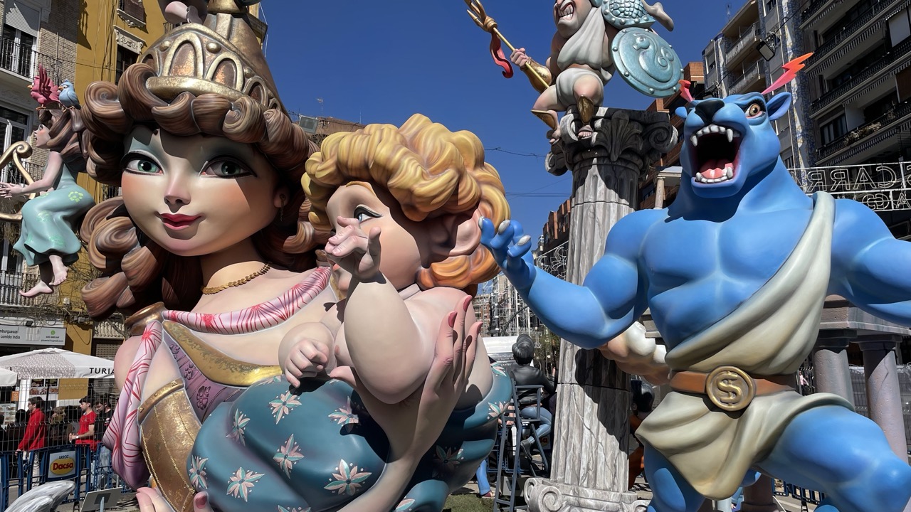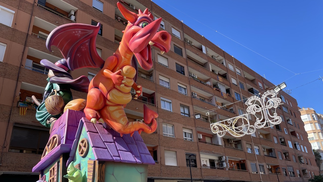 Today, I went into Valencia to see more of the Fallas, that is of the ones one can find all over town. Rather than just the spectacular ones in the inner city. Many quarters have one, often of moderate size, but definitely very much worth the while. I just wandered from the Cabanyal train station towards the harbor, further towards and through the center and continued a bit more. Here are some impressions, not just of the statues, but also of what else is part of the celebrations: the Fallas competitions, the party tents, the fireworks, the flower displays, the churros and porras, the crowds, the scarfs, the traditional clothes and the spring blossoms. Do scroll down to also see the videos of a small parade and the daytime fireworks at the central square / Plaza del Ayuntamiento.