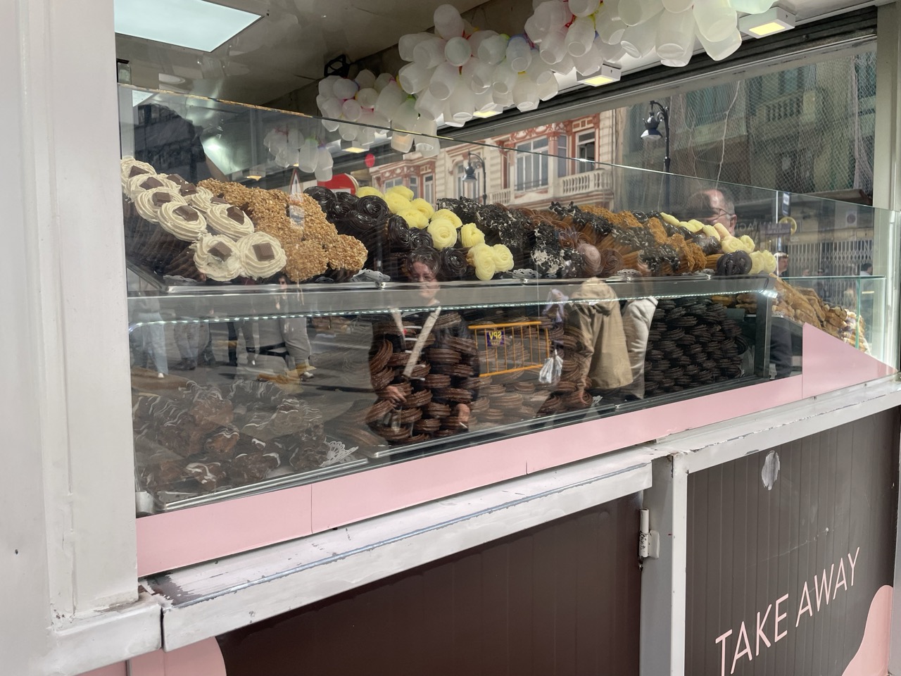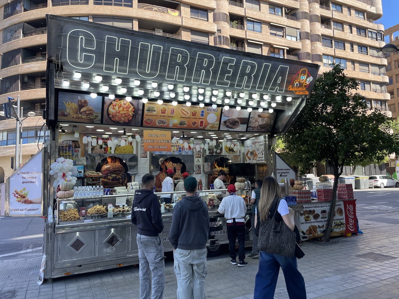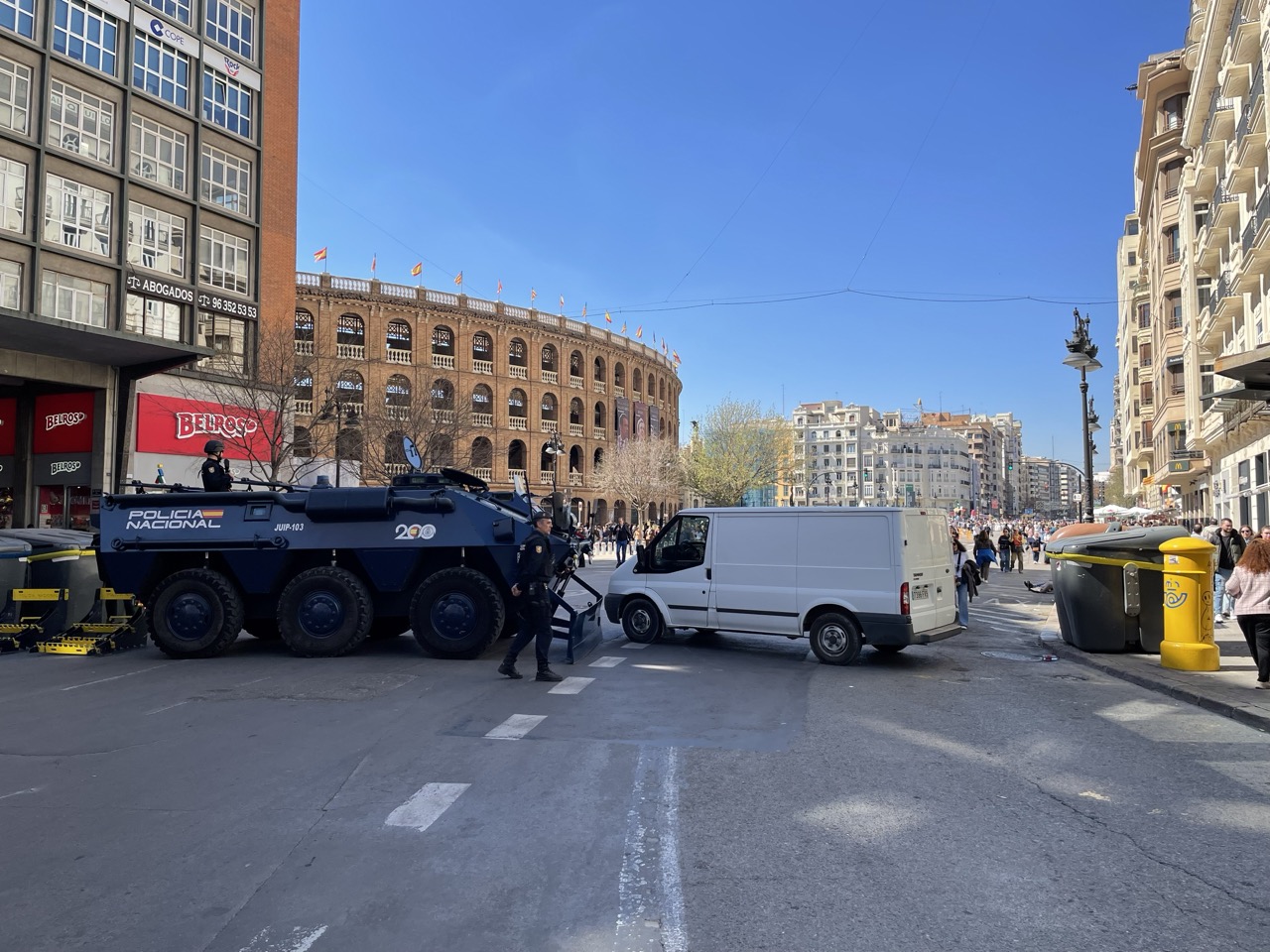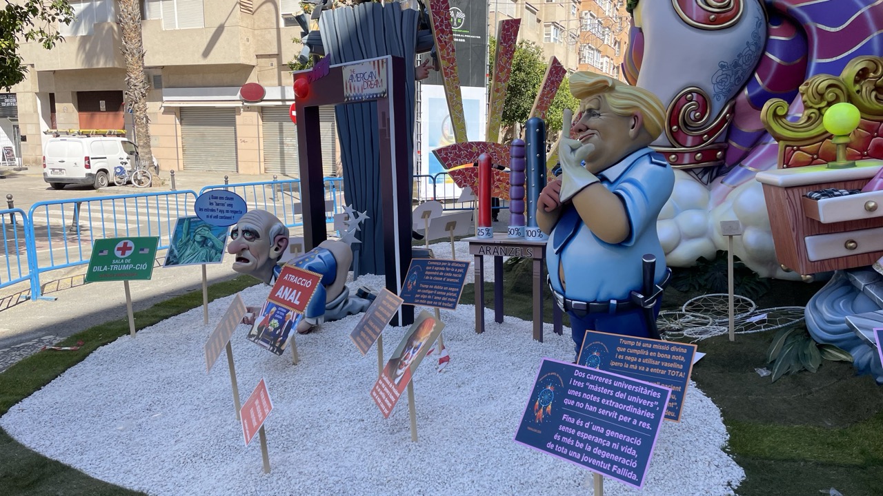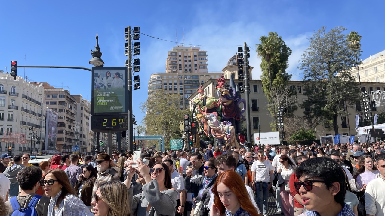 Today, I went into Valencia to see more of the Fallas, that is of the ones one can find all over town. Rather than just the spectacular ones in the inner city. Many quarters have one, often of moderate size, but definitely very much worth the while. I just wandered from the Cabanyal train station towards the harbor, further towards and through the center and continued a bit more. Here are some impressions, not just of the statues, but also of what else is part of the celebrations: the Fallas competitions, the party tents, the fireworks, the flower displays, the churros and porras, the crowds, the scarfs, the traditional clothes and the spring blossoms. Do scroll down to also see the videos of a small parade and the daytime fireworks at the central square / Plaza del Ayuntamiento.