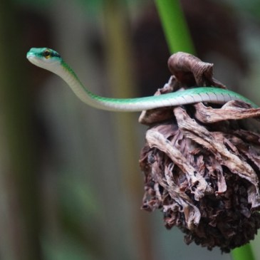 Some weeks ago, when I was cutting some of the heliconias that grow besides the house, I got a little scare from a bright green snake that suddenly fell on the floor from one of the leaves/branches that I was cutting. Ever since the heliconia incident, we have been on the lookout. Today, we saw it again. … More Green Parrot Snake on the hunt